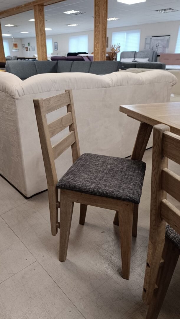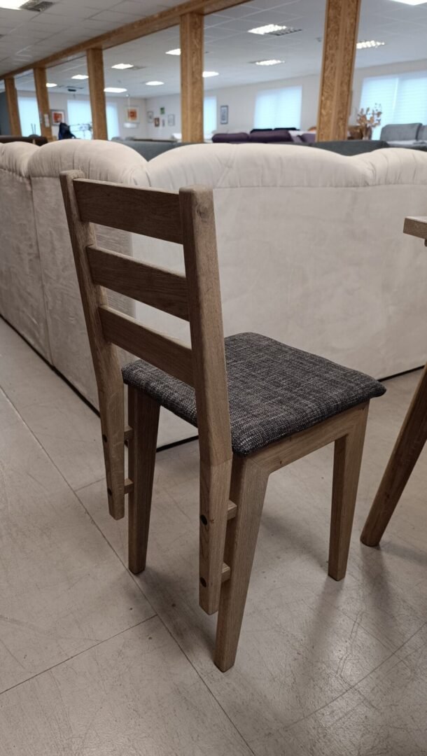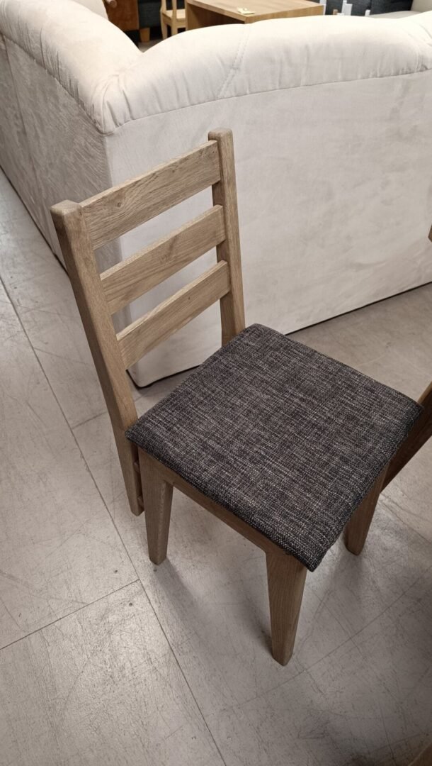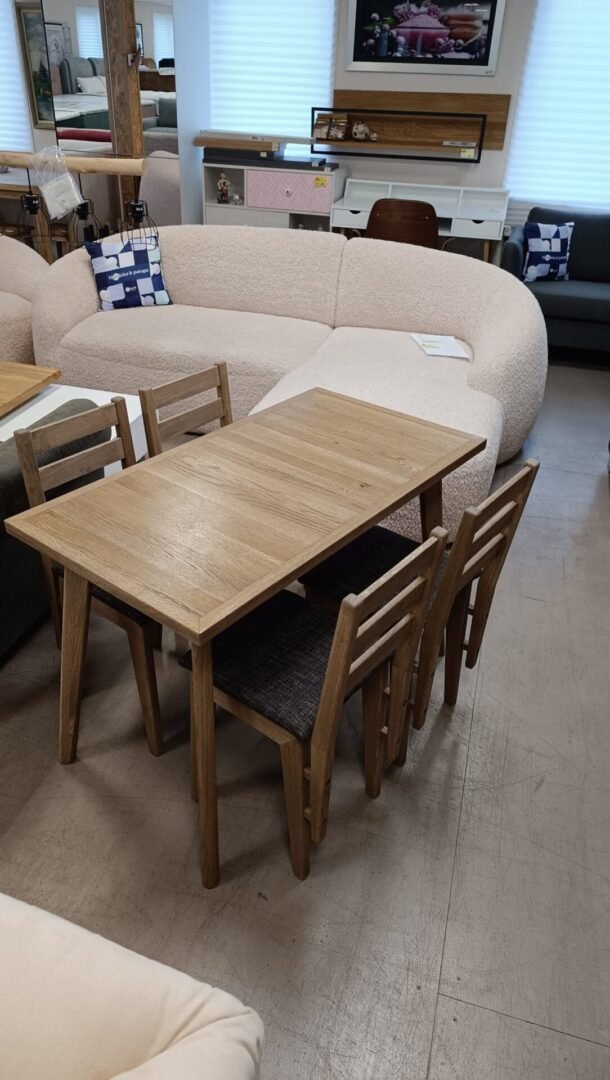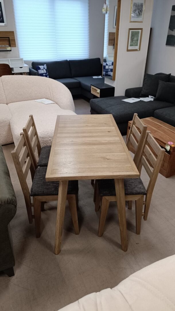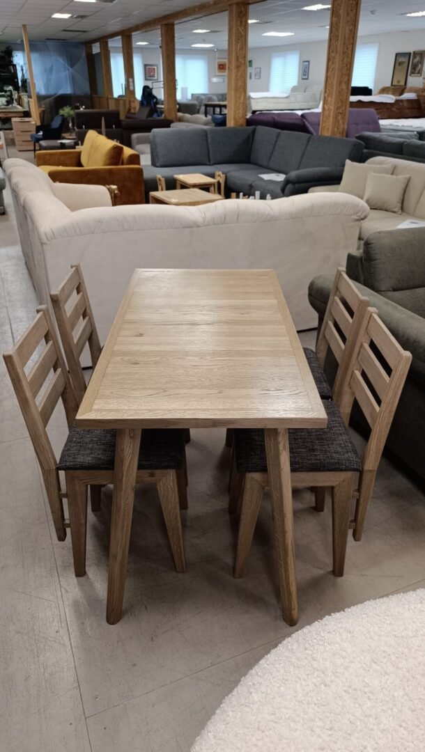 Pristatome išskirtinį valgomojo komplektą, pagamintą Lietuvoje iš aukščiausios kokybės lietuviško ąžuolo. Tai rankų darbo, vienetinis baldų komplektas, sudarytas iš stalo (105.5 x 55.5 x 72 cm) ir keturių kėdžių su atlošais (35 x 40 x 79 cm, sėdimos dalies aukštis – 46 cm). Klasikinis dizainas ir natūralios medienos tekstūra suteikia jaukumo bei elegancijos jūsų valgomajam ar virtuvei. Dėl kompaktiškų matmenų šis komplektas puikiai tinka tiek mažesnėms, tiek didesnėms erdvėms.