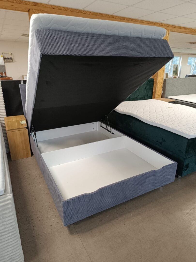 Lova „Dot Grey“ pasižymi praktine savybe – integruota patalynės dėže. Tai puikus sprendimas, norint sutaupyti erdvės ir laikyti įvairius daiktus, tokius kaip pagalves, antklodes ar kitą miegamojo reikmenų inventorių. Dėžė lengvai atsidaro ir suteikia patogią prieigą prie daiktų, tad jūsų miegamasis išlieka tvarkingas ir organizuotas.