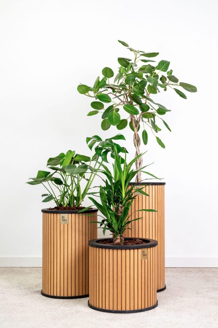 🔸 „HARMONY“ vazonų komplektas (Mini, Midi ir Maxi) –  medinis vazonai su ratukais