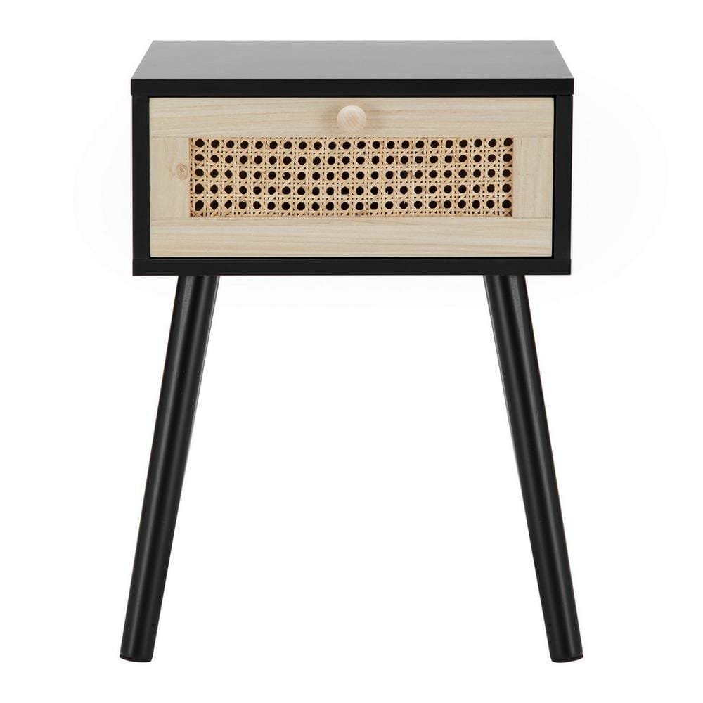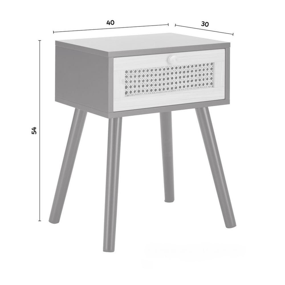 Iš tikro medžio ir medžio dekoro pagamintas šoninis staliukas, kurio matmenys yra apie 40 x 54 x 30 cm (plotis x aukštis x gylis), stovi ant 4 kūginių kojų ir turi praktišką stalčių su patraukliu ratano priekiu.